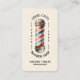 Revitalisez votre marque avec nos cartes de visite vintages de salon de coiffure ! Dotés d'un poteau de barbier peint à l'aquarelle rétro en rouge, blanc et bleu emblématique, ces cartes présentent une configuration de texte unique dans une formation à deux arcs entourant le poteau. La typographie rétro classique ajoute une touche de charme intemporelle à votre marque. Cool, tendance et tout à fait unique, ces cartes sont parfaites pour les coiffeurs et stylistes qui souhaitent faire une déclaration. Commandez dès maintenant et montez l'image de votre barbier avec une touche de vintage allure !