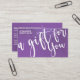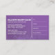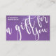 C'est le carte de visite cadeau parfait pour une femme d'affaires branchée, élégante, féminine et moderne. Ce design présente une simple typographie manuscrite de script de brosse blanche sur une parties scintillant violet violet brillant imbriquée et violet violet clair ombre dégradé glamour et arrière - plan chic. C'est la façon idéale de permettre à vos clients d'acheter un cadeau pour leur famille et leurs amis et en même temps de promouvoir votre entreprise. ***REMARQUE IMPORTANTE DE CONCEPTION : Pour toute demande de conception personnalisée, comme les demandes de produit assorties, les changements de couleur, les changements de placement ou toute autre demande de modification, veuillez cliquer sur le bouton "CONTACTER" ou envoyer un courriel au concepteur directement à lafemme.art@gmail.com. Vous pouvez même lui envoyer par courriel une demande pour un design entièrement personnalisé et nouveau.