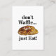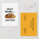 Waffle Food Restaurant Funny Business Card original design by Nisha Prabhu. Fully Customizable. Personalize with your details. Make a flipping good impression with our Waffle Food Restaurant Funny Business Card! Designed for waffle enthusiasts, brunch spots, and dessert bars, this playful business card captures the delicious charm of your establishment and serves up your contact information with a side of humor. Featuring a delightful and eye-catching graphic of mouthwatering waffles with syrup, toppings, and a fun pun, this business card is sure to spark conversations and leave a memorable mark on anyone who receives it. Perfect for food truck owners, café managers, or anyone in the culinary industry, this business card not only showcases your restaurant's branding but also adds a fun twist that sets you apart from the competition. Ideal for networking events, trade shows, or simply handing out to customers, it’s a conversation starter that resonates with food lovers.