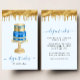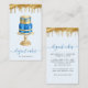 This elegant bakery business card features a royal blue and gold wedding cake illustration on a pale blue ombre background, with a top border of gold dripping faux foil. Customize it with your business name in blue handwriting script with swashes at the beginning and end, and your contact information in black sans serif font. (To keep the swashes, replace only the letters in those text fields, leaving the symbols in place.)