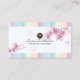 Ce design carte de visite wedding planner présente un bel arrière - plan constitué de fleurs de cerisiers pastel tendues entre des bordures de carreaux pastel en haut et en bas. Un panneau de texte élégamment bordé se trouve au milieu de la carte. Dans ce panneau de texte se trouve votre logo, votre nom commercial et votre texte commercial. Conçu pour les thèmes floraux, beauté, mode, dames, femmes, design, beaux-arts.
