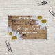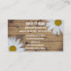 Cartes de visite sociaux rustiques de médias de fleurs en bois et de marguerite pour des wedding planners et des organisateurs d'événement épousant des cartes de visite d'organisateur avec rustique, arrière - plan en bois de grange. L'avant a le nom au manuscrit élégant et au titre professionnel ci-dessous. Les fleurs sauvages de marguerite de pays ornent vis-à-vis des coins. Sur le dos, la raison sociale est en haut avec l'email personnalisé, les affaires et le téléphone portable numérotent, et de divers contacts sociaux de médias pour des occasions promotionnelles telles que le site Web personnel, le Facebook, lié, le gazouillement, ou n'importe quels détails ou information faits sur commande de contact que vous préférez. Dos d'arrière - plan en bois rustique assorti et de conception florale dessus. Pas simplement pour des organisateurs, mais pour beaucoup de professions, particulièrement ceux se sont rapportés aux mariages, aux fleurs, à la santé, et à la beauté comme des fleuristes, des stylistes en coiffure, des spas de beauté, des thérapeutes de massage, des maquilleurs, des stylistes en coiffure, des manucures, etc. grands pour la mise en réseau professionnelle. Gardez les frais supplémentaires pour distribuer. Perfectionnez pour les entreprises qui se spécialisent dans des mariages campagnards rustiques, tels que des mariages de grange, des mariages extérieurs, des mariages de jardin, des mariages orientés occidentaux, etc. Tous les styles, couleurs, et tailles des textes peuvent être changés. Cliquez sur le bouton de personnaliser pour éditer.