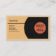 A vintage-style business card with a close-up of a well-worn vinyl record with subtle scratches and a red label. A warm, yellow-toned background, evoking a sense of nostalgia and the warm crackle of analog sound.
