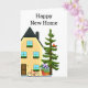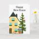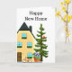 Cette carte de vœux a été créée pour les nouveaux propriétaires. Le recto de la carte présente une illustration d'une maison avec un arbre et une plante en pot. Il y a également un message à l'intérieur et une ligne de signature.