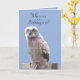 Le hibou assis sur la clôture "Qui - o - o - s Anniversaire est-ce?" devant. À l'intérieur de "C'est ton anniversaire ! Ayez une grande journée." à l'intérieur avec du texte au-dessus de la tête de hibou avec un arrière - plan bleu pâle. Le texte intérieur peut être customisé.