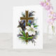 Une croix Brown avec une bordure blanche au milieu d'une tulipe blanche et de feuilles verts avec un fond de brume bleue et isolé sur blanc. Le mot Confiance dans le Seigneur. Et Il vous bénira. Adorez avec tout votre coeur. Il vous surveillera. Écoutez ce qu'il vous dit. Il parle tranquillement à ton oreille. Obéissez à son moindre mot. Il vous apprendra beaucoup sont sur la deuxième page de la carte de voeux