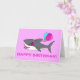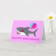 Carte de voeux avec requin mignon avec ballons de fête aux fleurs roses aux couleurs rose, violet et turquoise. Le texte dit "Joyeux anniversaire !" La conception est personnalisable et vous pouvez personnaliser le texte.