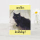 Cette carte de vœux présente un chat noir duveteux avec un air surpris et les mots 'Un autre anniversaire?'. L'intérieur indique : 'Ne vous inquiétez pas ! Vous vous améliorez chaque année !'