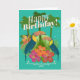 Turquoise Arrière - plan fun unisex Happy Birthday Card avec un thème tropical incluant palmiers, oiseaux toucans, fleurs d'hibiscus, feuilles de palmiers, et autres couleurs et illustrations tropicales.