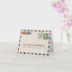 Personnalisez cette étiquette "airmail" vintage en détresse pour la carte de chaque invité qui sera posée sur leur assiette. Ceci est prévu pour un 50ème anniversaire. Ajoutez une vieille photo sur le devant qui fera office de timbre avec l'âge et le nom. Personnalisez une carte à la fois avec le nom de chaque invité et ajoutez une question amusante sous forme de jeu de connaissances pour animer la conversation à table. Ajoutez la question à l'intérieur. Si vous avez besoin de modifications sur ce design (couleurs, etc.), envoyez simplement un email à paula@labellarue.com