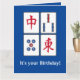 Carte de vœux/anniversaire de conception de tuiles de jeu de Mahjong avec couleur de fond et texte personnalisables.