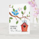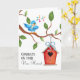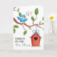 Envoyez une carte de vœux de félicitations à votre nouveau propriétaire préféré ! Cette carte adorable présente un oiseau bleu du bonheur sur le devant, chantant du haut d'une branche d'arbre avec une maison dans l'arbre suspendue en dessous. Le texte à l'intérieur est facilement mis à jour pour votre message personnel ou utilisez le nôtre.