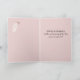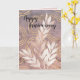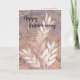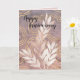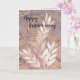 Cette carte de vœux d'anniversaire présente des frondes feuillues de couleur or rose sur fond rose et bleu avec des vagues dorées. Les pages intérieures sont d'un rose assorti avec un spray de feuilles sur le côté gauche.