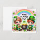 Carte de vœux de la Saint-Patrick avec un garçon et une fille mignons portant des chapeaux de lutin, un pot d'or, des trèfles et un arc-en-ciel