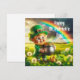 Carte de vœux de la Saint-Patrick avec un sympathique lutin tenant un pot d'or dans un champ de trèfles et un arc-en-ciel