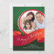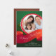 Carte de vœux de Noël élégante et stylée avec une bannière rouge portant les mots Joyeux Noël avec des branches de sapin et un cadre rond pour votre photo de vacances sur fond vert sapin. Personnalisez avec vos informations et ajoutez votre photo de famille unique et vous êtes prêt à partir.