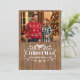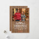 Cette carte de vœux photo personnalisée incarne le confort des fêtes rustiques et chaleureux. Le design est divisé entre un panneau photo supérieur chaud et accueillant et un panneau de message inférieur richement texturé. La photo, encadrée par une bordure sombre, capture un couple (ou une famille) à l'air de fête sur un fond flou de lumières de Noël scintillantes et d'un arbre décoré. Sous l'image, la carte présente une texture de bois époustouflante dans une tonalité marron chaud. Le message "NOUS VOUS SOUHAITONS UN JOYEUX NOËL ET UNE BONNE ANNÉE" est affiché dans une belle typographie blanche, accentué par des icônes hivernales charmantes, des rennes et des fioritures décoratives tourbillonnantes. Les noms "Roméo & Juliette" complètent le sentiment en bas, offrant