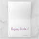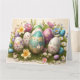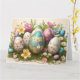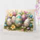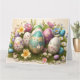 Carte de Pâques joyeuse avec des œufs disposés sur un lit de fleurs printanières. Couleurs pastel. Peut être personnalisée avec un message personnel et le nom de la famille et une date facultative.