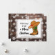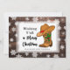 Cherchez-vous une carte de Noël de style country pour souhaiter à vos amis et à votre famille un Joyeux Noël ? Voici une carte charmante avec des illustrations de bottes de cowboy avec du houx, un chapeau de cowboy et le texte « Nous vous souhaitons à tous un Joyeux Noël ». Fond en bois rustique et flocons de neige.