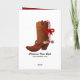 Fun style occidental carte de voeux de Noël fait dans un vieux look de papier et en gras texte rouge personnalisé. Les graphismes d'une botte de cowboy marron sont tous décorés de façon festive avec une branche de saint et un sucre de canne rouge et blanc. Personnalisez cette carte de vacances unique pour lire ce que vous voulez.