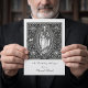 Belle image d'art linéaire catholique traditionnel noir et blanc du Sacré-Cœur de Jésus. À l'intérieur se trouve le verset de l'Écriture « Je m'approcherai de l'autel de Dieu, du Dieu qui donne la joie à ma jeunesse » et un verset sur le côté droit de la carte.