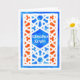 Une carte de voeux de Ramadhan avec un motif islamique traditionnel de trellis dans le blanc sur un arrière - plan bleu et orange. Le texte dans le carreau central ; est dans le blanc et lit, "Ramadhan Kareem". Conception peinte à la main dans les aquarelles par Judy Adamson. L'intérieur est laissé vide pour votre propre message.