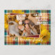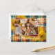 Carte de vacances de Thanksgiving unique, élégante, tendance, jolie et décorative. Carte de vacances de Thanksgiving unique, élégante, tendance, jolie et décorative. Texte mignon REMERCIEMENTS BÉNIS pour Thanksgiving et espace pour personnaliser ou adapter avec une photo et les noms (ou nom de famille) de votre choix. Avec de jolies fleurs classiques de Mums jaunes chauds de l'automne sur un fond à carreaux tartan de teinte sarcelle bleue verte, orange citrouille et rouge vin bordeaux foncé inspiré de la ferme rustique. Et un poème de salutation de saison personnalisable au verso de la carte.