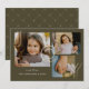 Nous vous présentons notre carte de vœux de Noël avec collage de photos "Elegant Modern Joy" - une façon moderne et chic de capturer l'esprit des fêtes avec une touche de sophistication. Cette carte présente un fond vert foncé qui donne un ton riche et élégant et une typographie unique en faux or frappé, ce qui en fait un choix stylé pour envoyer des vœux chaleureux. Le mot "JOY" est affiché de manière élégante dans une typographie moderne et unique en faux or, ajoutant une touche de glamour et de festivité au design. Remarque : l'effet de feuille d'or est simulé dans l'œuvre d'art, et aucune feuille d'or réelle n'est ajoutée lors de l'étape d'impression. 3 de vos photos sont affichées dans une disposition de collage moderne, ce qui donne une carte de vœux de Noël saisissante et stylée qui transmet vos salutations les plus chaleureuses. Le verso de la carte de Noël présente un design élégant coordonné, et vous pouvez ajouter du texte et des photos supplémentaires en utilisant le bouton "Modifier à l'aide de l'outil de conception" lors de la personnalisation de la carte. Célébrez la saison des fêtes avec style et sophistication en envoyant notre carte de vœux de Noël avec collage de photos "Elegant Modern Joy". Que vous partagiez la joie et l'amour de votre famille, que vous