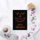 Un visage de citrouille effrayant sur fond noir. Le devant a un visage en feuille métallique et "Joyeux Halloween" avec une ombre/une surbrillance orange. Le verso comporte une lanterne citrouille orange avec un message effrayant.