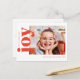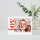 C'est une carte de vœux rouge et blanc lumineuse et simple qui présente une photo unique minimaliste combinée avec « joie » dans une police serif classique élégante et grasse.