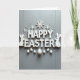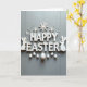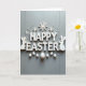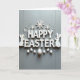 Cette carte de vœux présente des lettres blanches en relief qui épellent un joyeux message de Pâques sur un fond de bois gris clair légèrement texturé, avec des ombres douces qui rendent le message proche et accueillant. Les lettres ont une surface légèrement usée, ce qui ajoute une touche confortable et vécue sans paraître négligée. Deux silhouettes de lapins blancs simples sont assises près de la partie inférieure du texte, inclinées comme un doux couple partageant un moment de calme 🐰. Au-dessus du texte, des formes délicates semblables à des cristaux et de minuscules perles rondes sont dispersées comme une légère pluie, ajoutant de l'éclat sans surcharger le design 🌷. Une rangée soignée d'œufs blancs repose sous le message, chacun parsemé de fines taches qui ressemblent à de minuscules étoiles. Le texte est centré et d'un blanc éclatant sur des gris superposés, ce qui le rend facile à lire tout en conservant un aspect général calme et romantique. La partie supérieure présente les