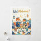 Une illustration chaleureuse et joyeuse d'Eid Mubarak célébrant la famille, la convivialité et l'esprit des fêtes islamiques. Cette charmante œuvre d'art présente une scène familiale heureuse avec des personnages d'animaux joueurs habillés de vêtements traditionnels, partageant des friandises sous un croissant de lune, des lanternes et un ciel nocturne festif. Les couleurs douces et le style de livre d'images le rendent particulièrement attrayant pour les familles et les enfants.