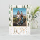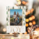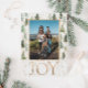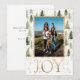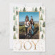 Un design élégant et festif avec un thème de couleur vert, or et blanc. Des pins verts avec une poussière d'or ornent une photo encadrée à partager avec les proches. Le mot Joie ajoute une touche de gaieté et de sophistication avec une police classique de couleur or simulée. Le verso comporte un message personnalisable en noir avec le mot amour en or massif.
