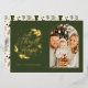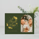 A modern dark green and gold foil religious holiday card. On the reverse is a pattern of green and navy holly and pine leaves. Personalize with your favorite photo and sign off.