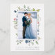 Elégante aquarelle Winter Greenery and Blue Floral Joyeux Mariage de Noël Photo Newlysée Holiday Card inclut des feuilles de verdure botanique d'hiver, des baies bleues, des fleurs bleues, du coton et des baies rouges. Cadre et texte de l'huile d'argent.