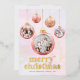 Share your holiday joy in elegant style with this blush pink and gold ornament photo Christmas card. Featuring a soft pastel background, luxurious gold foil accents, and beautifully designed hanging ornaments to frame your favorite family photos. This modern yet timeless card radiates festive charm.