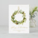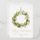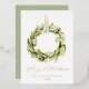 Envoyez vos voeux de vacances à vos proches avec notre belle carte de vacances non photo. L'élégante carte de vacances comprend une couronne de vacances en aquarelle composée de pinèdes, de cônes de pin et de feuilles verts accrochés au ruban beige clair. L'expression "Joyeux Noël" est affichée ci-dessous dans un script moderne en feuille d'or. Personnalisez l'avant de la carte de Noël sans photo en ajoutant votre nom et l'année. La carte inverse pour présenter votre message personnalisé contre un arrière - plan vert sage.