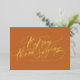 BON THANKSGIVING ! Envoyez à votre famille et à vos amis vos salutations Thanksgiving avec cette carte postale Bon thanksgiving personnalisable. Il présente une calligraphie moderne en feuille sur un arrière - plan orange. Personnalisez en ajoutant vos détails. Cette feuille d'or Thanksgiving carte postale est disponible dans d'autres couleurs de feuille et de carton.