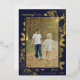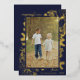 Cartes de Noël élégantes comportant une photo verticale encadrée de détails floraux dorés. Bleu foncé avec accents de feuille métallique. Meilleurs vœux !