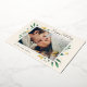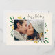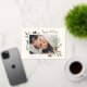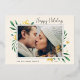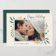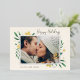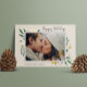 Elégant et festif, le carte photo de vacances encadre votre image horizontale ou paysagère préférée avec une subtile bordure de pont et un feuillage vert de vacances en regardant les coins. Des fleurs et des baies de feuillage doré complètent le design. "Happy Holidays" apparaît en haut à droite dans le script de calligraphie, avec vos noms et l'année en bas à gauche.