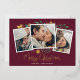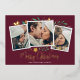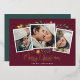 Elégant et festif carte photo de vacances encadre trois de vos photos carrés préférées avec une bordure de pont subtile et feuillage vert de vacances en regardant aux coins avec des fleurs poinsettia en feuille d'or et des baies. "Joyeux Noël" apparaît en bas dans le script de calligraphie de feuille, avec vos noms sous.