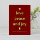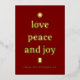 This elegant minimalist design celebrates the classic "Love, Peace and Joy" message with luxurious gold foil typography on a classic burgundy background. This design is perfect for anyone seeking truly personalized holiday stationery with sophisticated flair. Fully customizable with your names and greeting. Ideal for spreading Christmas joy with premium elegance and timeless appeal.