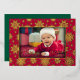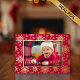 Elégant flocon de neige Photo Frame Foil Carte de vacances. Un script tourbillonnant typographie orthographique Premier Noël et votre nom personnalisable et année aussi en papier réel. Ajoutez votre photo, la superposition de la photo Shadow à l'intérieur du cadre doré donne un effet 3D à la photo et cadre Moderne, classique et traditionnel pays des merveilles hivernales avec des flocons de neige tombant en feuille sur un arrière - plan rouge. Les options de feuille sont Gold, Silver et Rose Gold. Customisez le texte, le texte arrière est facultatif ou supprimez. Un souvenir pour les nouveaux parents, la famille et les amis.