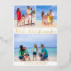 Carte de Noël chic et personnalisable avec feuille d'or représentant une famille sur la plage avec vos photos tropicales préférées au soleil. Ajoutez 3 de vos souvenirs préférés de vos vacances sur l'île sur le devant et un au dos. Une belle carte de vacances côtière avec une disposition de photographies moderne et propre et une jolie écriture bleue.