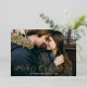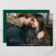 Carte de vacances simple avec votre photo horizontale pleine saignée avec "Joyeux Noël" affichée en papier doré élégant. Personnalisez la carte de Noël avec votre nom de famille et l'année. La carte inverse pour afficher un arrière - plan vert avec des points blancs subtils.