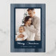 Make a luxurious and traditional statement this holiday season with this magnificent striped photo card. The deep navy blue background is covered in crisp, vertical stripes, all shimmering brilliantly in luminous silver foil. Your favorite family photo is elegantly framed in the center, with the handwritten "Merry Christmas" script also glowing in beautiful silver foil, giving your card an instantly upscale and festive look.