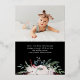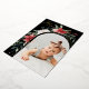 Ces beaux cartes photos de vacances arborent votre photo personnelle préférée sur le devant, entourée d'une forme d'arc moderne pleine de poinsettias de Noël aquarelle, de fleurs et de verdure et le mot "joie" dans la calligraphie de feuille d'or sur un arrière - plan noir foncé. Des illustrations florales rouges et blanches traditionnelles et élégantes ornent à la fois l'avant et l'arrière de la carte, et l'arrière de la carte offre également de la place pour une deuxième photo et votre propre message personnel pour la saison.