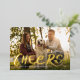 Ce carte photo festif et amusant du Nouvel An présente une lettre de brosse "Cheers!" en papier doré contre une photo horizontale. Répandez Nouvel An Soyez heureux avec ce simple carte photo de vacances de Lea Delaveris Design. Idéal pour les couples, les familles et plus encore, cette carte de vacances est parfaite pour une variété de photos. Le dos est un noir chic avec un motif blanc et a de la place pour trois photos supplémentaires avec un message personnalisé plus long.