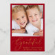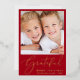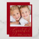 Elégante carte de vacances rouge saisonnière avec votre photo et "Grateful" dans un script de feuille d'or. Personnalisez avec votre salutation ("Joyeux Noël" "Joyeux Fêtes"), nom et année.