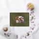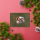 Un arc festif et des branches botaniques en feuille d'or déclencheront magnifiquement votre photo de vacances en famille. Sous la photo, les mots "Joyeux Noël !" apparaissent dans une typographie élégante et claire au-dessus d'un modèle pour votre nom de famille. L'arrière - plan en cuir vert décolle le papier et donne une impression de luxe à la carte postale. L'arrière de la carte postale est en cuir beige pour une autre touche spéciale.